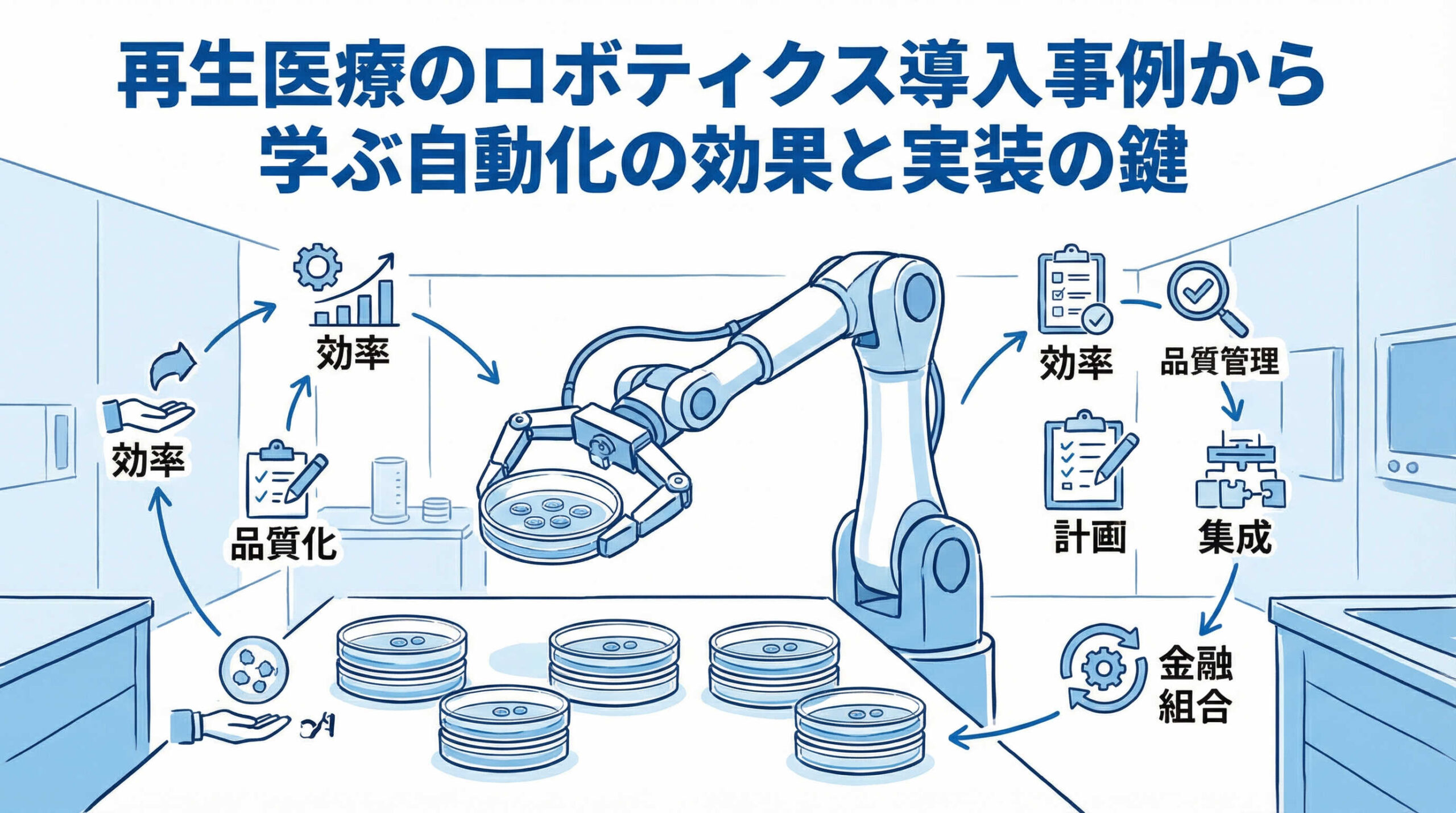 本記事では、再生医療分野における「ロボティクス導入事例」を具体的に解説します。工程別の活用例から施設規模別の実装モデル、さらには導入による定量的な効果まで、現場の視点に立って詳しくご紹介します。貴社の課題解決に向けたヒントとして、ぜひお役立てください。